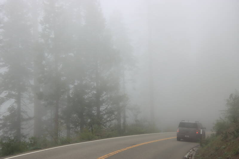 Dikke mist op onze eerste rit richting Yosemite Valley