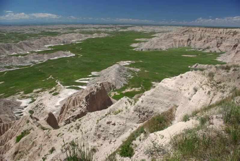 Vanaf hier heb je uitzicht op het Sage Creek Wilderness Area. Kenmerkend is het uitzicht op de enorme, met gras bedekte butte van de Badlands-formatie die bekend staat als Hay Butte, een van de belangrijkste herkenningspunten in het wildernisgebied. Het is niet ongebruikelijk dat je hier bizons en dikhoornschapen ziet, niet alleen in het landschap maar ook op de wegen.